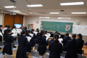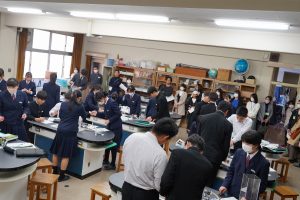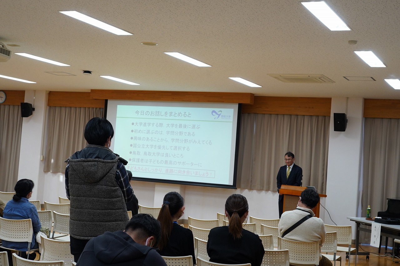 本日(11/22) 5限を参観授業とし、たくさんの保護者や地域の方々にご来校いただきました。生徒たちも今日の晴天のように、晴れやかな笑顔と元気な様子で授業を受けていました。日頃から行っている研究授業の一環として、生徒たちは”見られる”ことに慣れているようにも感じました。その後、午後2時から3時30分まで多目的室で懇話会の方々にお世話になり教育講演会を開催しました。講師に、鳥取大学教育支援・国際交流推進機構入学センターの森川修教授をお招きして、「ローカルからグローバルまでの諸問題の解決に取り組む鳥取大学」というテーマで、大学に進学する目的をしっかりと持つこと、視野を広げると選択肢が広がることなどについて幅広い知見に基づくお話をしていただきました。