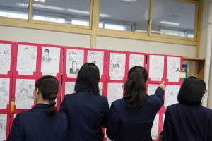 主に3年生の点描による自画像と卒業研究レポートがあります。(生活学習室)