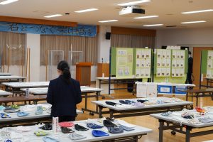 書写や夏休み自由研究、各教科・部活動の課題レポートや美術作品、技術・家庭科作品などがあります。(多目的室)