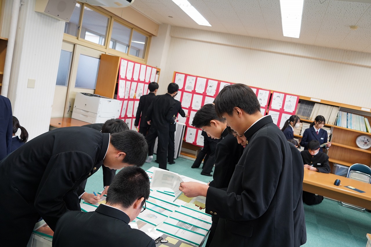 主に3年生の点描による自画像と卒業研究レポートがあります。(生活学習室)