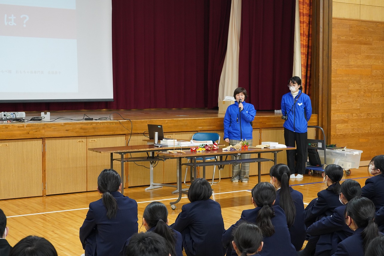 郷土玩具の魅力 2026.02.05 本日(2/5)の1~2限、1年生を対象とした「郷土玩具の学習」を行いました。美術科による企画で、郷土玩具が生まれた土地の風土や生活習慣を知り、地域文化と美術の関わりを学ぶことをねらいとしました。生徒たちも郷土玩具の魅力を再発見し、改めて文化継承の意味や意義について考えを深めることができました。講師としてお越しいただいたわらべ館職員の方々に深く感謝申し上げます。※武道館は暖房の効いた状態で行っています。 « お知らせ一覧に戻る