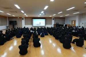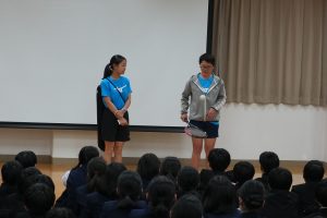 14日放課後に多目的室で部活動OR(オリエンテーション)を行いました。例年、1年生を対象に各部活動の様子を説明します。今年も各部活動の部長を中心にパワーポイントを使用したプレゼンあり、実際に道具を扱う体験ありと、工夫を凝らした内容に1年生は興味津々でした。そして本日16日から部活動体験(17時まで可)が始まり、楽しそうに体験する1年生の姿が見られました。