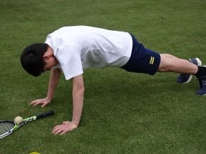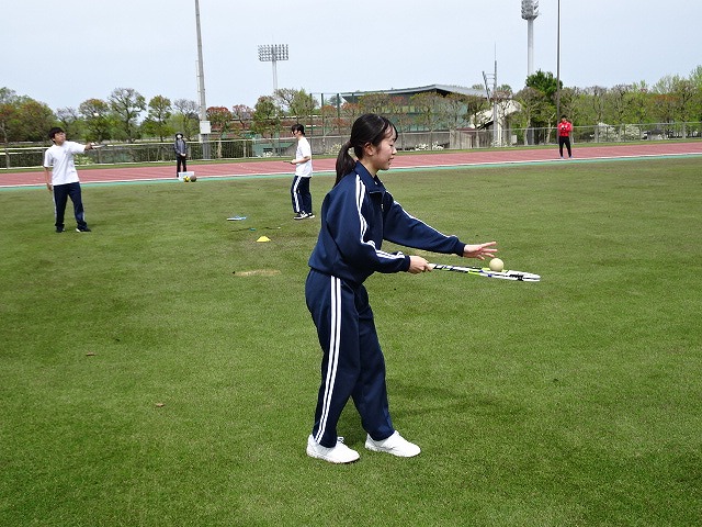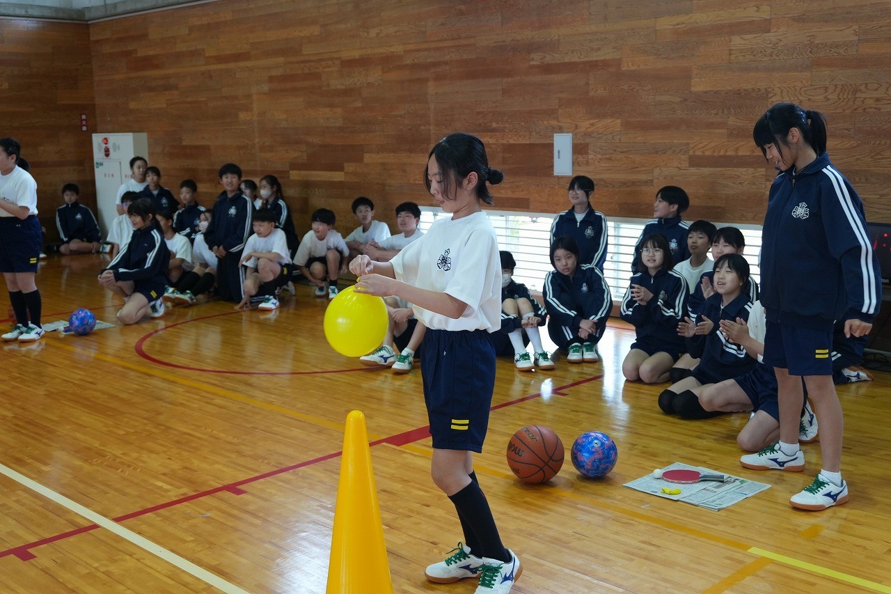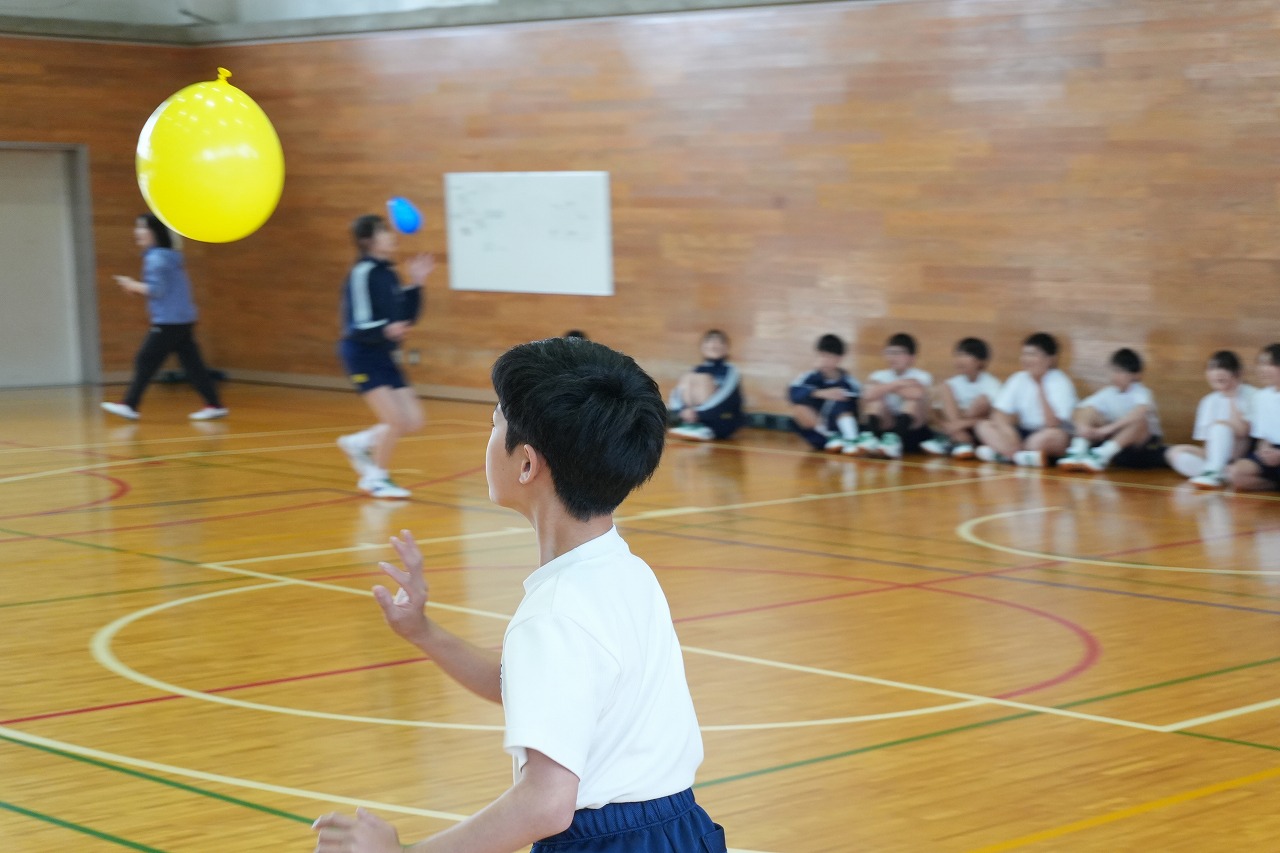 1年 クラス対抗リレーですが風船やボールがバトンの代わりです。