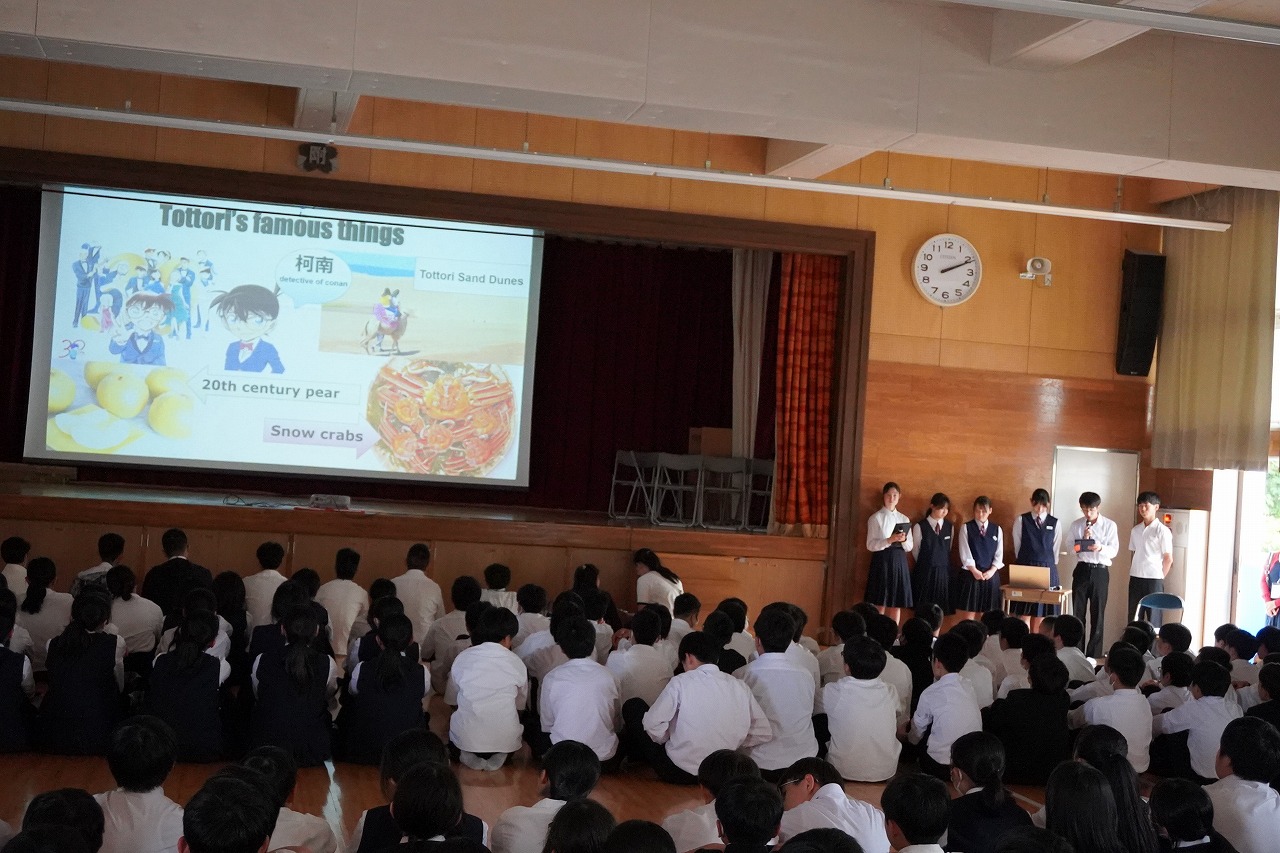 本日の5,6限に台湾との国際交流を行いました。鳥取大学と台湾東海大学は学術協定を締結しており、両大学の研究者や学生が交流してきました。そして、昨年度から鳥取大学附属中学校と台湾東海大学附属高中学校の生徒も、手紙やビデオレターなどによる生徒交流が進められてきました。今回はこれまでの両校の相互交流をさらに発展させ、初めて対面での国際交流となりました。前半は歓迎式典や生徒会主催による学校紹介のプレゼン、全校生徒による校歌斉唱などを行い、後半は3年生の4クラスに分かれて英語での自己紹介やゲームなどで交流を深めていました。生徒同士すぐに打ち解け合って、楽しく有意義な異文化交流となりました。